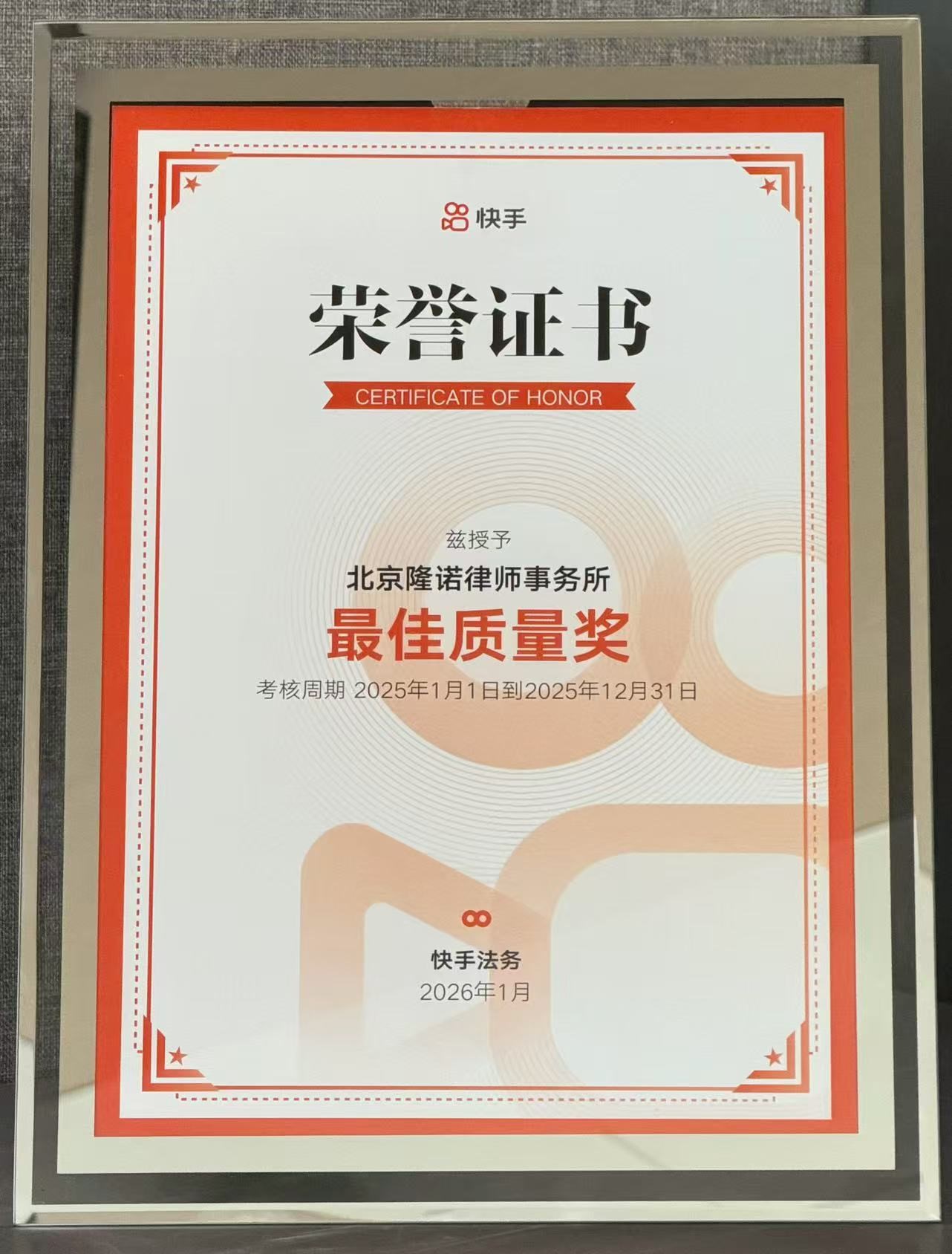 2026年1月,国内短视频与直播领域头部互联网企业快手科技正式公布2025年度知识产权服务供应商考核结果,北京隆诺律师事务所凭借卓越的专业能力和严苛的案件质量管控能力脱颖而出,成功斩获“最佳质量奖”。